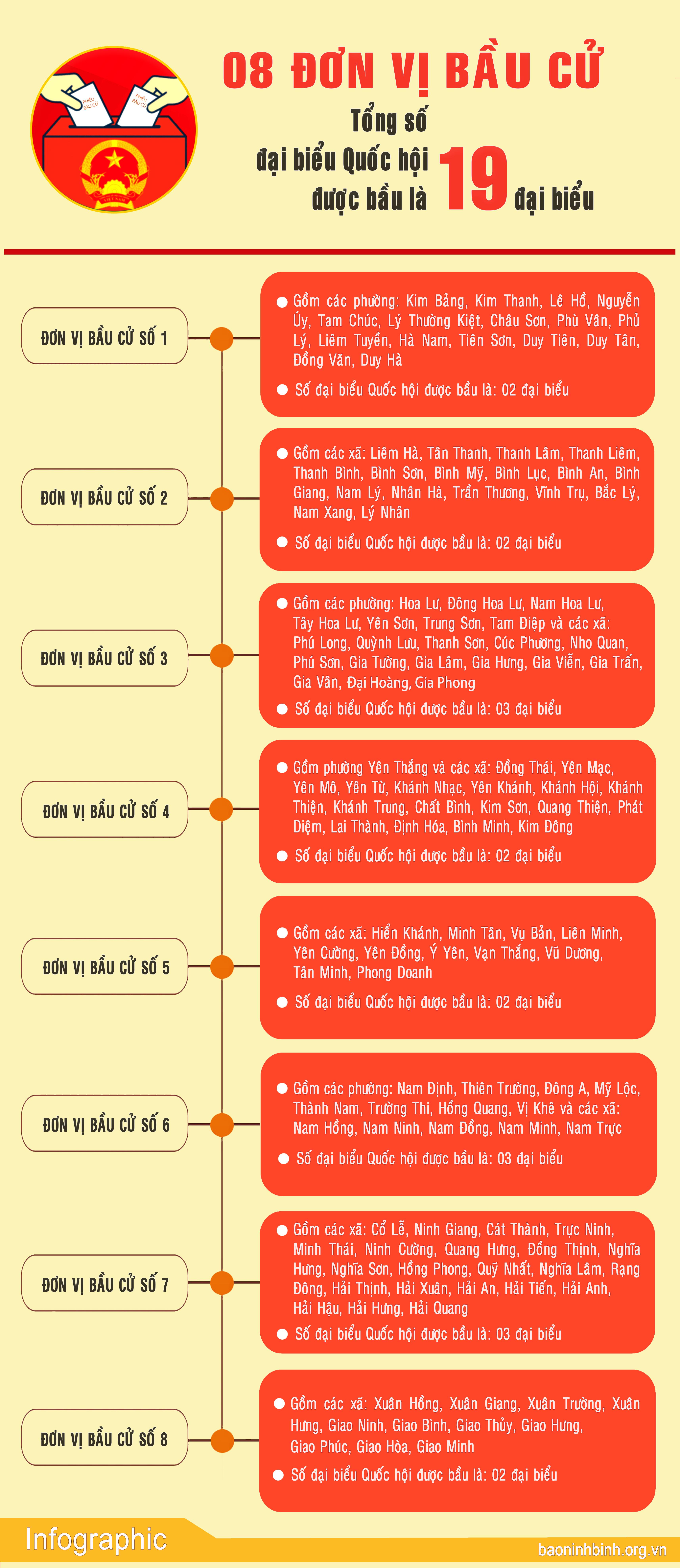 Tỉnh Ninh Bình có 8 đơn vị bầu cử và số đại biểu Quốc hội được bầu là 19, (Ban hành theo Nghị quyết số 151/NQ-HĐBCQG ngày 14 tháng 02 năm 2026 của Hội đồng Bầu cử quốc gia) về số đơn vị bầu cử, danh sách các đơn vị bầu cử và số lượng đại biểu Quốc hội được bầu ở mỗi đơn vị bầu cử của các tỉnh, thành phố.